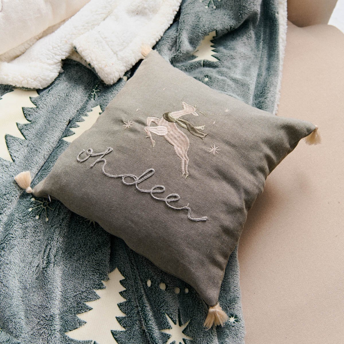Urocza poszewka z haftem jelonka i napisem "Oh deer"Dekoracyjne pompony na rogachWymiary: 45 x 45 cmIdealna do świątecznych aranżacji wnętrzaPoszewka świąteczna dekoracyjna z jelonkiem i pomponamiJeśli szukasz czegoś, co doda Twojemu wnętrzu niepowtarzalnego uroku, poszewka ALBIERO jest stworzona...