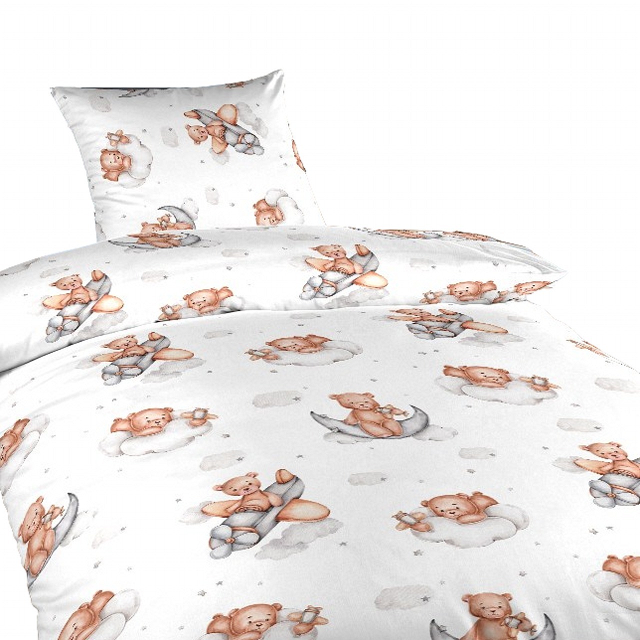 Obsah balení: 1x polštář o rozměru 45x60 cm a 1x povlak na přikrývku o rozměru 90x130 cm.Dezén: Teddy bear plane.Bavlněné povlečení je oblíbené pro svoji měkkost, vysokou savost a prodyšnost.Materiálové složení: 100% česaná bavlna, nevysrážená (nejkvalitnější příze, hladký a příjemný povrch na...