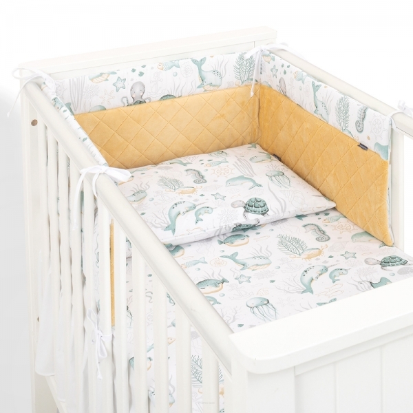 Mantinel s povlečením do postýlky, 3D sada Minky, Oceán, zelená/písková/bílá; 120x90