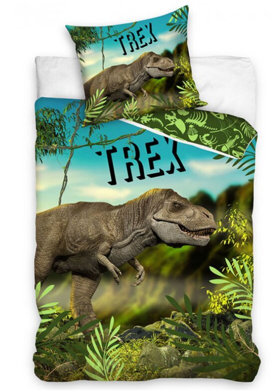 Dětské povlečení T-Rex v pralese, je vyrobeno ze 100% hladké bavlny a je oboustranné. Na lícní straně povlaku přikrývky je zobrazen největší ještěr a suchozemský predátor všech dob, Tyranosaurus Rex. Hledá kořist v hustém pralesním porostu. Reverzní strana povlečení je zelené barvy, s obrázky...