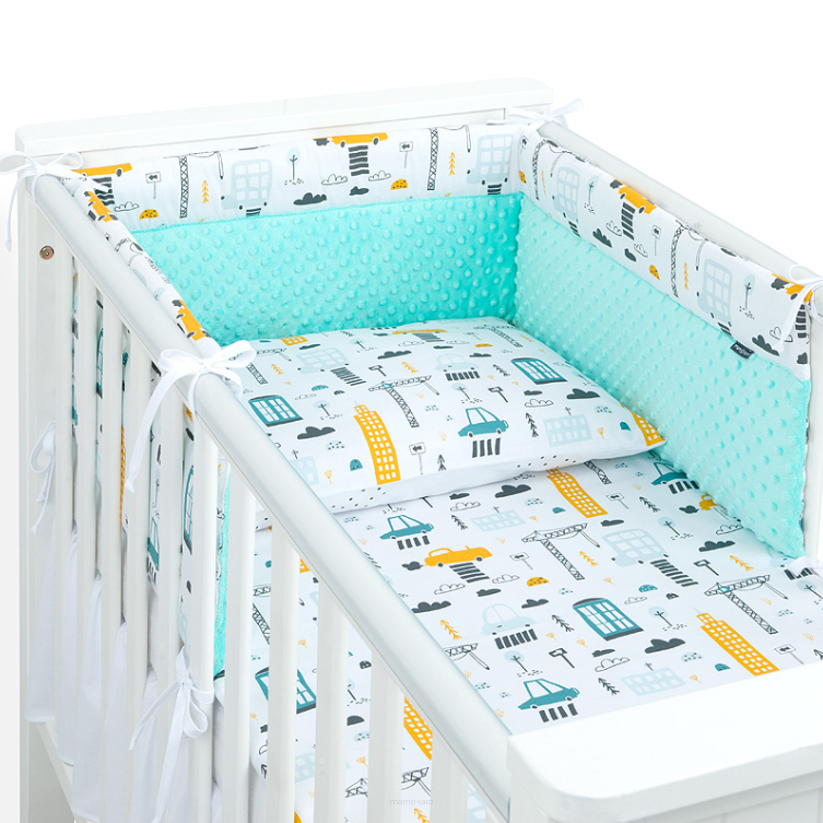 3-dílný set do postýlky Sada obsahuje: Mantinel – dvoubarevný – 30 × 180 cm, upevňuje se pomocí 8 stuh. Povlečení na polštářek – dvoubarevné – 40 × 60 cm. Povlečení na peřinku – dvoubarevné – 135 × 100 cm. Mantinel je vyroben ze 100 % bavlny, která je příjemná a hebká na dotek. Ideální pro...