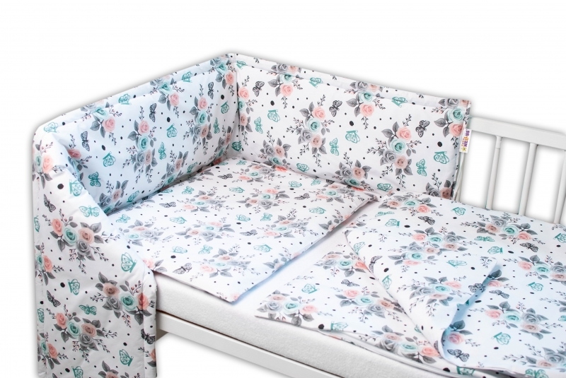 Baby Nellys 3-dílná sada Mantinel s povlečením - Růžičky, bílé; 120x90