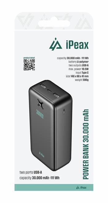 iPEAX Power banka 30000 mAh, 10,5W, 2x USB-A černá