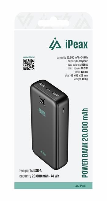 iPEAX Power banka 20000 mAh, 10,5W, 2x USB-A černá