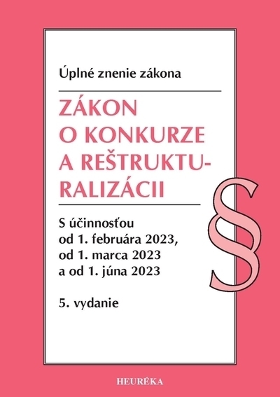 Publikácia obsahuje aktualizované úplné znenie zákona č. 7/2005 Z.z. o konkurze a reštrukturalizácii s zvýraznenými zmenami poslednej novelizácie: zákona č. 150/2022 Z.z. o zmene a doplnení niektorých zákonov v súvislosti s novými sídlami a obvodmi súdov s účinnosťou od 1. júna 2023, zákona č. 398/2022 Z.z., zákona č. 497/2022 Z.z. s účinnosťou od 1. marca 2023 a zákona č. 6/2023 Z.z. s účinnosťou od 1. februára 2023 Z.z.