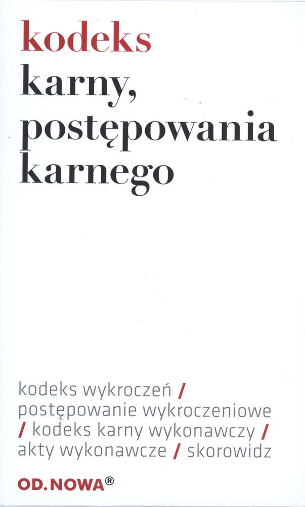 Kompletny, zaktualizowany zbiór aktów prawnych, na który składają się kodeksy: karny, postępowania karnego, karny wykonawczy, wykroczeń, postępowania w sprawach o wykroczenia, a także obszerny zbiór aktów wykonawczych. Uwzględnia zmiany prawne wynikające z uchwalenia ustawy o zmianie ustawy o...