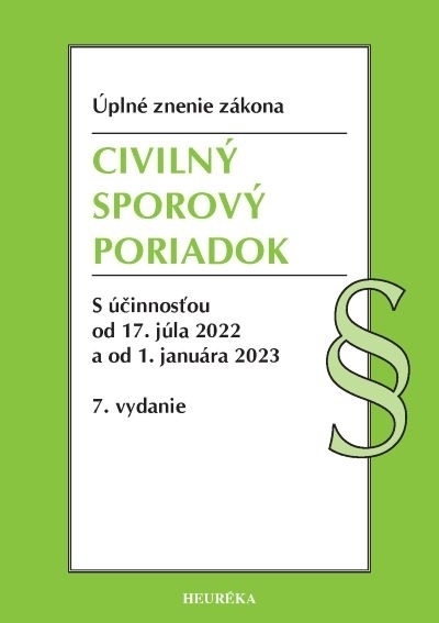 Publikácia obsahuje aktualizované úplné znenie zákona č. 160/2015 Z.z. Civilného sporového poriadku s výraznenými zmenami poslednej novelizácie zákona č. 108/2022 Z. z. s účinnosťou od 1. júla 2022; zákona č. 111/2022 Z.z. s účinnosťou od 17. júla 2022 a zákona č. 150/2023 Z.z. od 1. januára 2023.