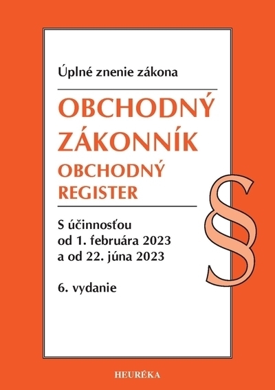 Publikácia obsahuje aktualizované úplné znenie Obchodného zákonníka č. 513/1991 Zb. so zmenami novelizácie: zákona č. 407/2022 Z. z. s účinnosťou od 22. júna 2023, a zákona č. 8/2023 Z. z. s účinnosťou od 1. februára 2023; a zákona č. 530/2003 Z. z. o obchodnom registri so zmenami novelizácie: zákona č. 494/2022 Z. z. s účinnosťou od 1. januára 2023 a od 1. júla 2023, a zákona č. 8/2023 Z. z. s účinnosťou od 1. februára 2023.