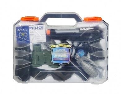 Zabawka z dźwiękami syreny policyjnej, strzelania, przeładowania broni oraz komendami policyjnymi w języku polskim: "Do wszystkich jednostek: Zgłaszam napad, ruszajmy do akcji", "Policja! Ręce do góry", "Stój, bo będę strzelał", "poddaj się, rzuć broń! Jesteś otoczony", "Jesteś aresztowany,...