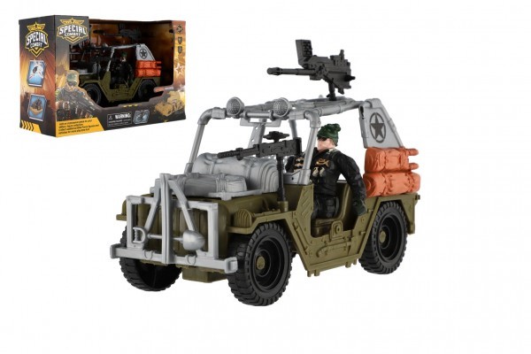 Auto vojenské terénní s vojákem plast s doplňky na volný chod zelené v krabici 27x18x12cm
