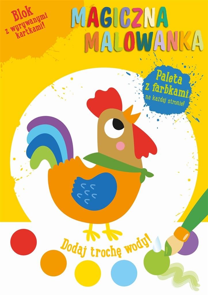 Magiczna kolorowanka! Na każdej stronie znajduje się rysunek do pokolorowania oraz paletka z farbami. Do książeczki dołączony został pędzelek. Strony łatwo wyrwać dzięki zastosowaniu perforacji. Wystarczy zamoczyć pędzelek w wodzie, potem w farbkach i zabawa z kolorowaniem gotowa.