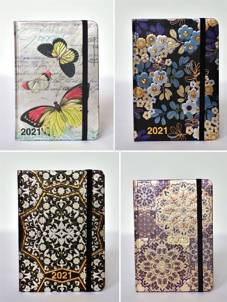 Mix wzorów. Towar wysyłany losowo.Opis: 70g papier białyRozmiar: 105 x 148 mmStron: 128Kalendarium: uproszczone, 3 języczneUkład: tygodniowy, tydzień po lewej stronie, po prawej miejsce na notatkiDruk: szaro-bordowyOkładka: laminowany papier metalizowanyDodatkowe informacje: na początku - planer...