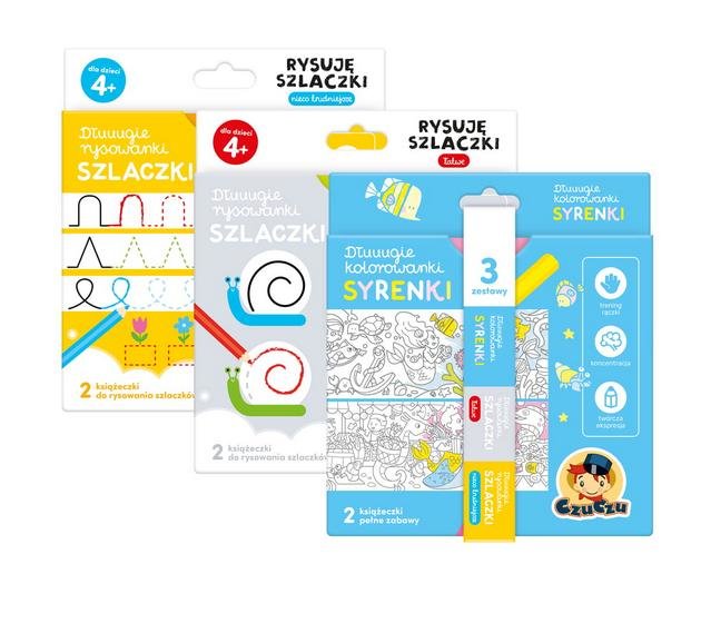 Kreatywny zestaw zawiera 3 tytuły: Dłuuugie rysowanki Szlaczki Łatwe, Dłuuugie rysowanki Szlaczki Nieco trudniejsze oraz Dłuuugie kolorowanki Syrenki.
