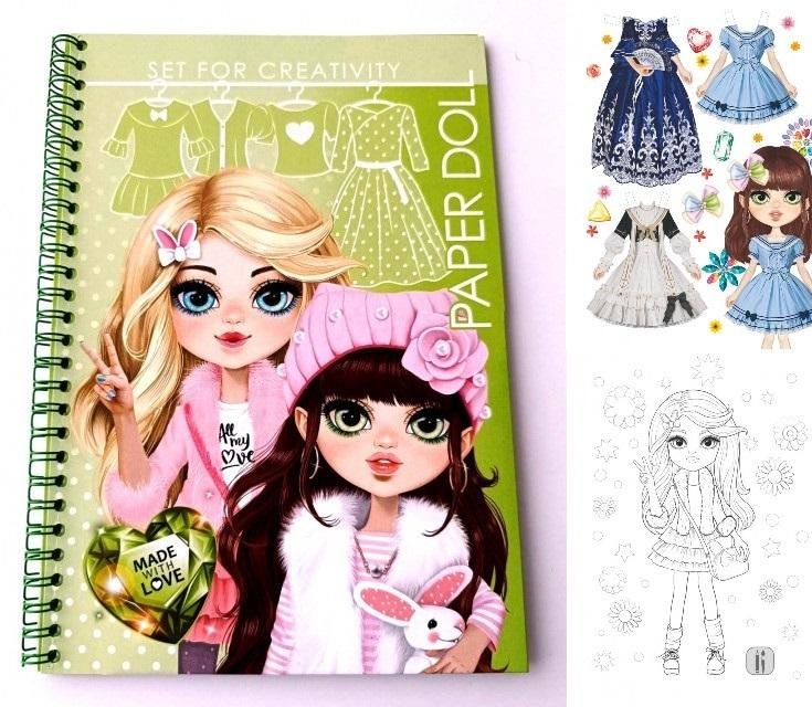 Papierowe lalki do zabawy. W środku znajdują się dwie modelki, które można ubrać w wycięte i pokolorowane przez siebie stroje. Wytnij je z książeczki, potem ubierz - zaginając specjalnie wystające kawałki papieru. Lalki i kostiumy mają wyraźne oznaczenia pokazujące, gdzie wyciąć, aby ubrania pasowały do lalek. Baw się nimi opowiadając najróżniejsze historie. Potem możesz przebrać lalkę i zacząć zabawę od nowa. Oprawa: spirala, wyprodukowano na Ukrainie.
