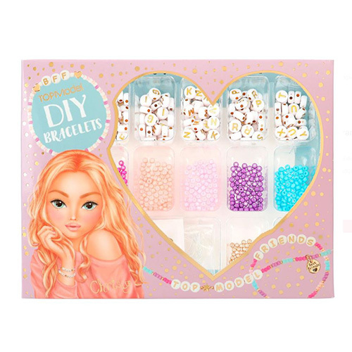 Vytvořte si vlastní náramky s motivy značky Top Model. Sada obsahuje 490 malých korálků různých barev, 207 korálků s písmenky, 6 zlatých visaček a 3 malé dárkové taštičky. Náramky můžete vytvořit až s 2 metry dlouhou gumou. Nechybí ani návod na správný uzel.Ideální dárek pro každou kreativní...