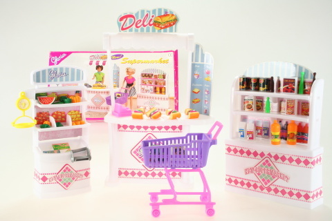 Glorie Supermarket obsahuje okýnko pro rychlé občerstvení s kasou. SOučástí jsou i 4 sendviče se surovinami, které lze oddělit. Dále 2 regály se zobžím 14 x 25 cm a 19,5 x 26 cm. Plastový nákupní košík 15 x 9 x 16 xm. A velké množství ovoce, zeleniny, konzerv, lahví, mléka, krabic a další. Panenky nejsou součástí balení. Věk 3+.