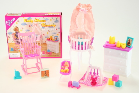 Glorie sada pre bábätko obsahuje všetko potrebné pre pestré hranie: bábätko, detskú komodu s vysúvacou zásuvkou (10 x 11 x 4 cm), postieľku s nebesami s priemerom 8,5 cm, lehátko (šírka 9,5 cm), hojdacie kreslo (výška 15 cm), detské hračky a potreby pre bábätko. Súčasťou je tiež obrázok chôvičky, ktorý podporí detskú predstavivosť. Pozor, bábika nie je súčasťou balenia.