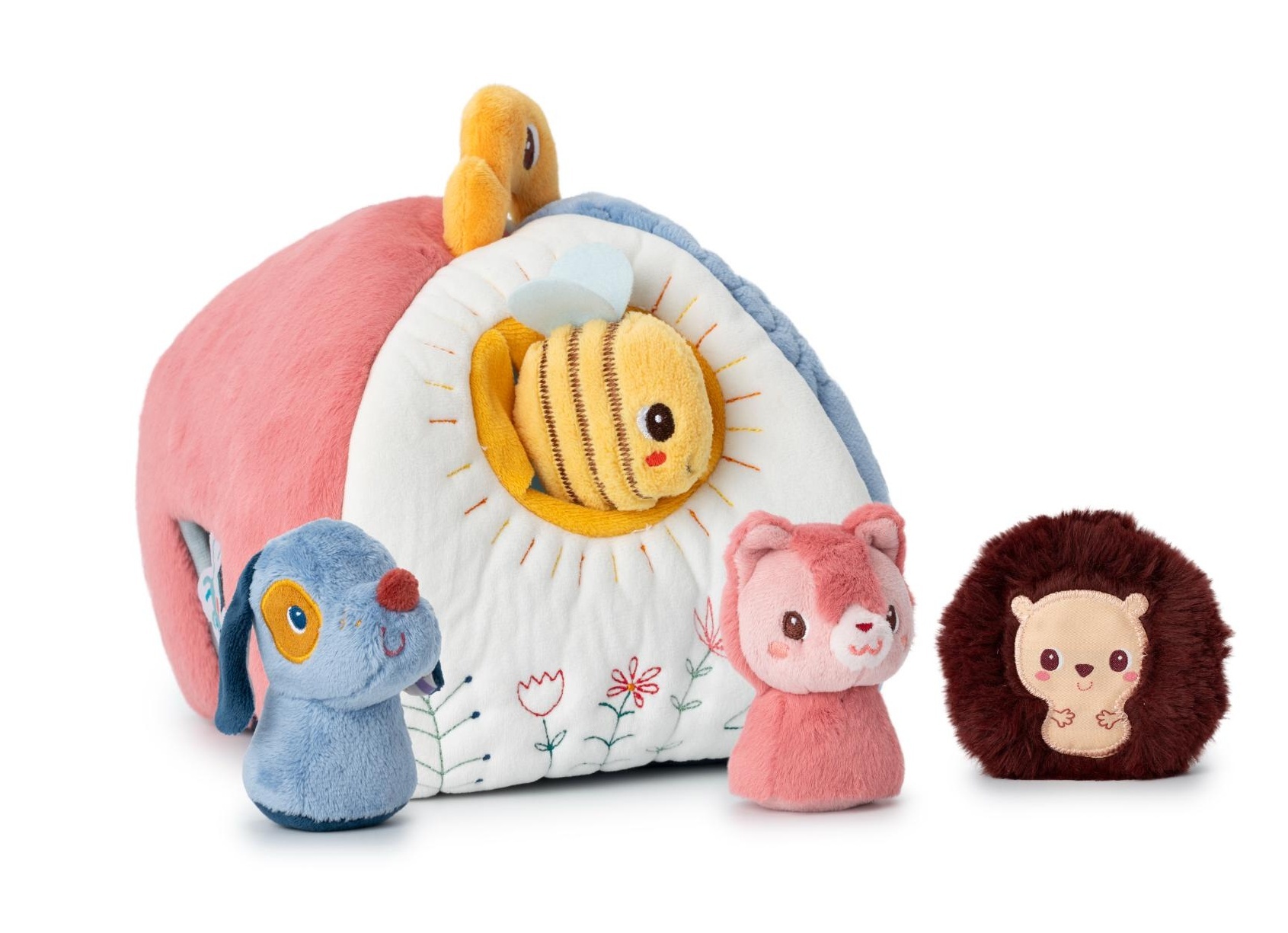 Kouzelný textilní domeček, který přináší nekonečné možnosti hry a objevování pro děti již od 9 měsíců. Tento hebký a barevný domeček má čtyři různé vchody, z nichž každý ukrývá jednoho zvířecího kamaráda: pejska, kočičku, ježka a včelku. Každé z těchto textilních zvířátek má v bříšku ukryté...