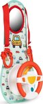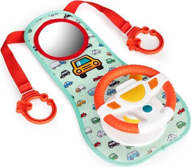 Interaktivní podložka s volantem slouží k zavěšení na opěrku hlavy ve vozidle. dokonale zpestří cestu vašeho batolete a zajistí klidnou jízdu autem otočný volant a tlačítka, která vydávají zvuky klaksonu a blinkrů tlačítko pro "startování" a zamykání auta 10 veselých melodií kulaté zrcátko...