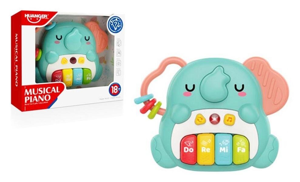 Zabawka organki słonik. Wydaje dźwięki, gra melodie, posiada także klawisze gamy: do, re, mi, fa i 4 przyciski funkcyjne. Dodatkowo na uchu posiada przeplatankę co będzie dla dziecka urozmaiceniem. Zabawka działa na baterie typu AAA. Baterie są załączone do zabawki. Zabawka dla dzieci od 18 miesiąca życia. Produkt zapakowany w kartonowe opakowanie.