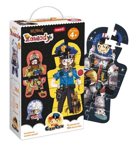 Edukacyjny zestaw puzzli pozwala dzieciom poznać 12 różnych zawodów i inspiruje do rozmów o pracy i zainteresowaniach.