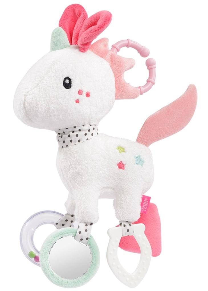 Zawieszka, maskotka edukacyjna, Jednorożec, z kolekcji: Aiko i Yuki. Słodki Jednorożec, to prawdziwa uczta dla Twojego maluszka! Serduszko, bezpieczne lusterko, mały gryzak, który przyniesie ulgę na etapie ząbkowania oraz grzechotka z tęczowymi perełkami, na pewno zainteresuje Twojego maluszka....
