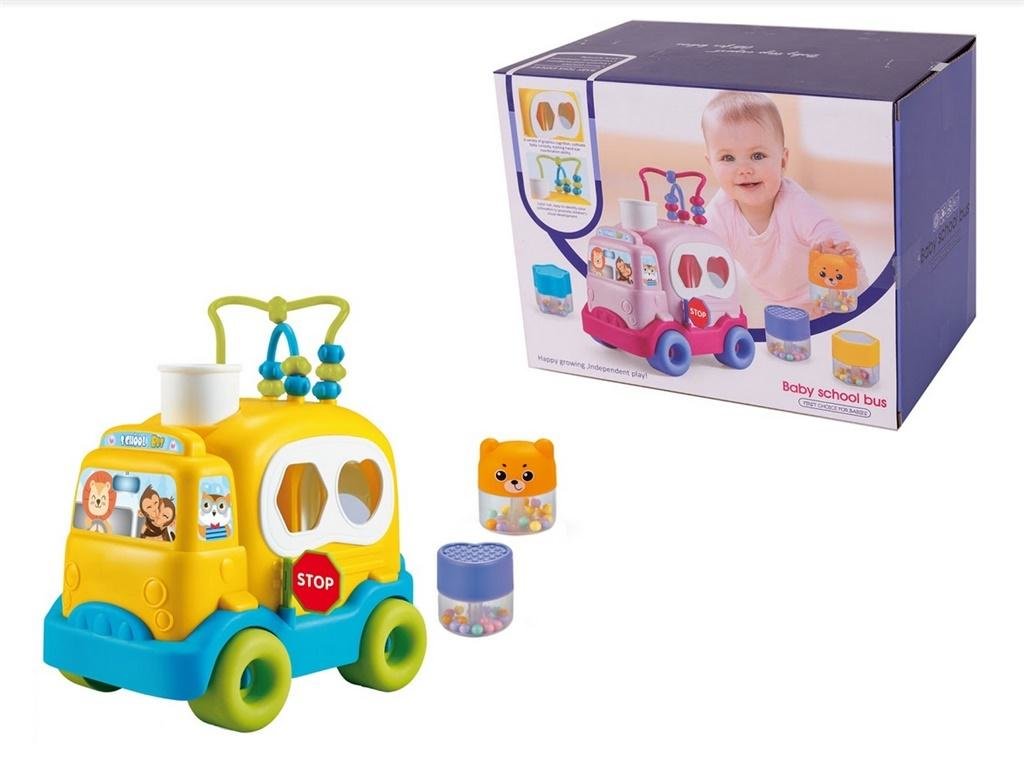 Autobus - sorter klockówDostępne 2 kolory - żółty, różowy. Towar wysyłany losowo.4 klocki - grzechotkiwymiary autobusu: 26x16.5x26 cm prečítať celé