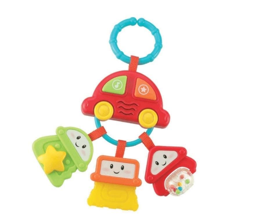 zawieszka w kształcie samochodzikuskłada się z breloczka z trzema kluczykamiżywe kolory przyciągną uwagę, zachęcając do zabawyzabawka może pełnić również funkcję gryzaczkaposiada dwa kolorowe przyciski funkcyjne które uruchamiają dźwięki, odgłosy i śmieszne melodyjkikażdy kluczyk posiada inną...