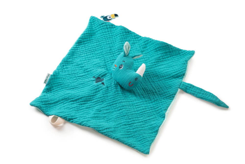 Měkoučký muchláček nosorožec Marius je ideální hračka do postýlky pro děti již od narození. Měkký dotek a postavička kamaráda nosorožce bude děti uklidňovat při usínání. Navíc si lze s nosorožcem hrát jako s loutkou a starším dětem tak můžete vyprávět příběhy. Lze využít i jako držák na dudlík. Rozměry muchláčka jsou 32 x 32 cm. Lze prát v pračce na jemný cyklus při 30°C. Vyrobeno z organické bavlny. Výplň je ze 100% polyesteru.