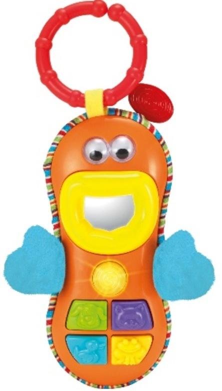 Zabawny Telefon zaciekawi Twoje dziecko wieloma wesołymi funkcjami. Interaktywna zabawka zachwyca kolorami, różnorodnością faktur i kształtem. Obszyta jest mięciutkim materiałem, można ją zawiesić na łóżeczku lub wózku, dzięki specjalnemu uchwytowi. Zabawka o żywych, radosnych kolorach najbardziej spodoba się najmłodszym dzieciom.
