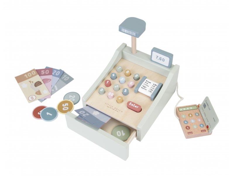 Bez pokladny nemůže fungovat žádný dětský obchod. Pokladna v krásném dřevěném provedení obsahuje skener, číslovaná tlačítka, bankovky a mince, zásuvku na peníze, platební terminál a platební kartu. Hra s rodiči, kamarády nebo oblíbenou panenkou může začít.