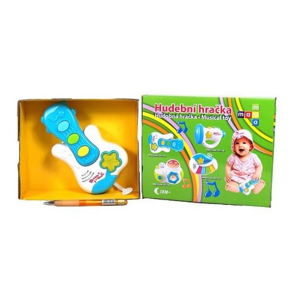Hrací kytara se zvukovými a světelnými efekty nesmí malému muzikantovi rozhodně chybět! Zvukové a hudební hračky děti velmi baví, podporují jejich cit pro hudbu, pro rytmus. Tříbí jejich smyslové vnímání, především zrak a sluch. Rozměry: 15 x 10 cm K provozu hračky jsou třeba 2 AA baterie.