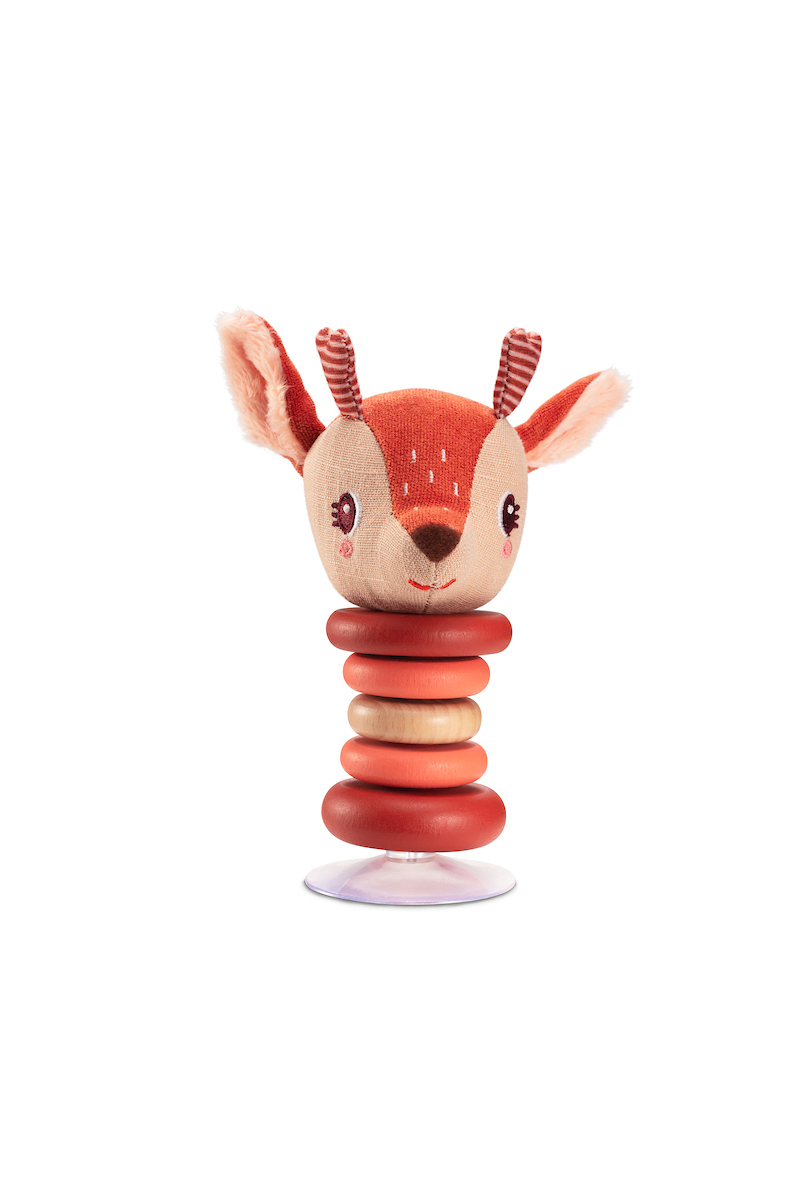 Zlobivý jelínek Stella chviličku neposedí. Stella ráda tancuje a od rána do večera řádí na všechny strany. Toto červené chrastítko s textilní hlavou jelínka se při sebemenším zatlačení vesele houpe do všech stran. Díky přísavce drží perfektně vzpřímeně a můžete jej připevnit téměř kamkoli.
