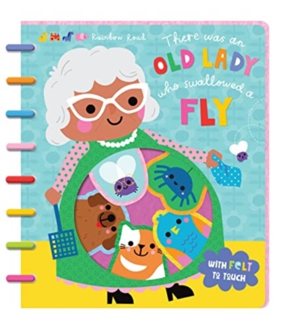 "There was an old lady who swallowed a fly . . . then wanted it gone straight away!Little ones will love this fun addition to our Rainbow Road series, with soft felt and card tabs to explore. Rainbow-coloured plastic loops hold the pages together, creating a tactile and durable spine."