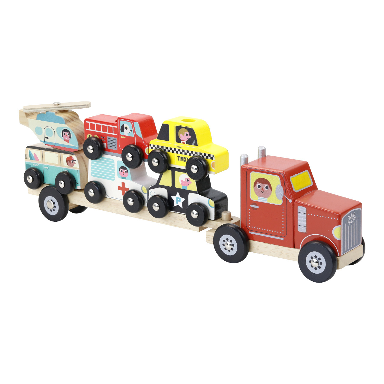 Netradiční pojízdná nasazovačka! Dřevěná nasazovací hračka ve formě kamionu s dlouhým přívěsem. Můžete na něj nasadit 6 dopravních prostředků – taxi, policejní auto, hasičské auto, sanitní vůz, helikoptéru a minibus. Ilustrováno Ingelou P. Arrhenius. Vhodné od 2 let. Hlavní vlastnosti: design...