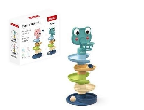 Zabawna wieża z piłeczkami do zabawy dla maluszka. Dziecko chwyta jedną z kolorowych, grzechoczących piłeczek, a następnie wrzuca je na samą górę, piłeczka toczy się na sam dół wieży i wypada jednym wyjściem. Następnie dziecko może rzucić piłeczkę do kosza, który jest umieszczony na samej górze...