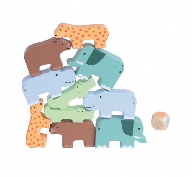 Lelin Dřevěná skládací hra - zvířátka, 10ks + hrací kostka