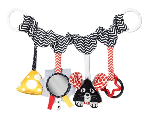 Závěsná edukační hračka.Kontrastní přívěsek Cheese & Skip je smyslová hračka, která pomáhá stimulovat smysly hmatu a zraku a rozvíjet motoriku dítěte. Připevněte jej ke kočárku, kolébce nebo autosedačce, aby se vaše dítě zabavilo při procházkách a výletech. Na části pokryté jemným materiálem jsou...