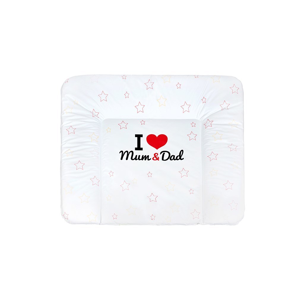 Praktická měkká přebalovací podložka New Baby z nepromokavého, plastového materiálu s obrázkem barevných hvězdiček a nápisem I love Mum and Dad. Rozměr: cca 85x70 cm, tloušťka cca 4 cm.Produkt české značky prečítať celé