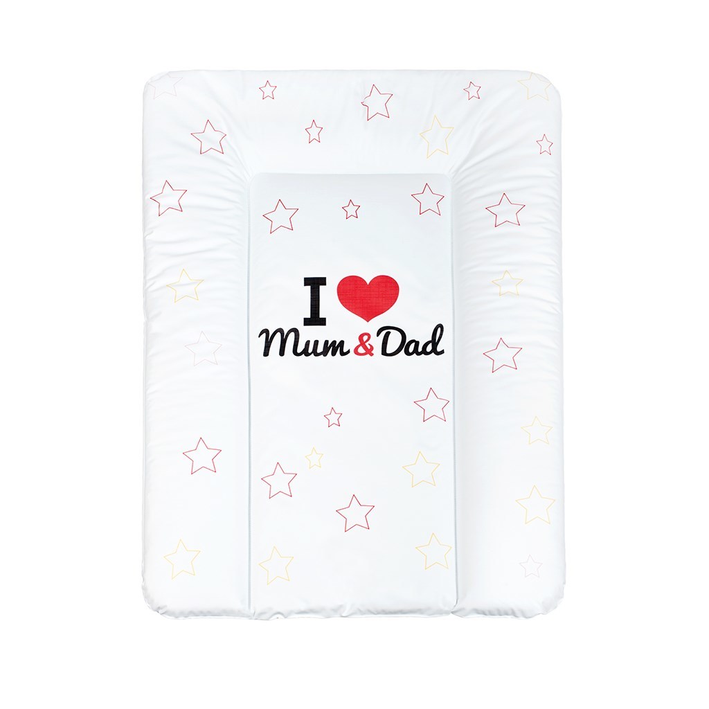 Praktická měkká přebalovací podložka New Baby z nepromokavého, plastového materiálu s obrázkem barevných hvězdiček a nápisem I love Mum and Dad. Rozměr: cca 70x50 cm, tloušťka cca 4 cm.Produkt české značky prečítať celé