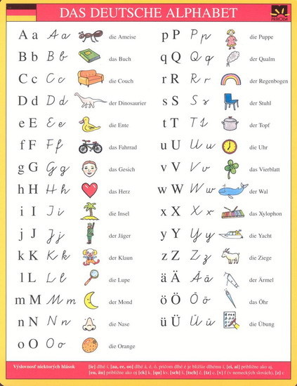 Nemecká obrázková abeceda pre najmenších. Stručný prehľad abecedy, kde sú obrázky slovne pomenované aj s výslovnosťou. Tabuľka je doplnená názvami dní, mesiacov, farieb a číslicami. prečítať celé