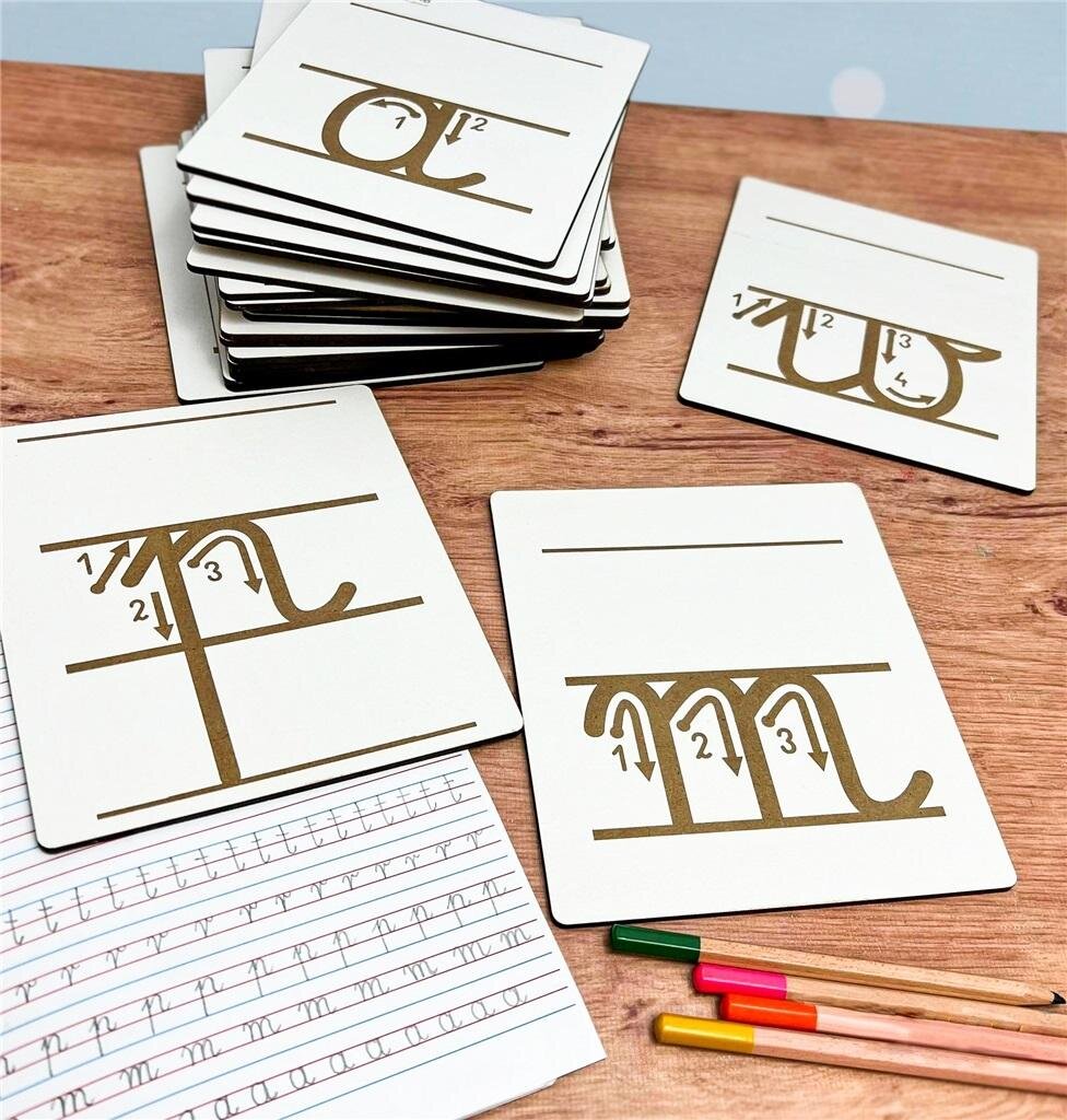 Prezentujemy drewniany alfabet do nauki pisania. Alfabet składa się z tabliczek drewnianych o wymiarach 16 cm na 14 cm. Na każdej tabliczce wygrawerowana jest litera w liniach (jak w zeszycie) wraz z prawidłowym kierunkiem jej pisania. Zestaw zawiera 24 tabliczki a, b, c, d, e, f, g, h, i, j, k,...