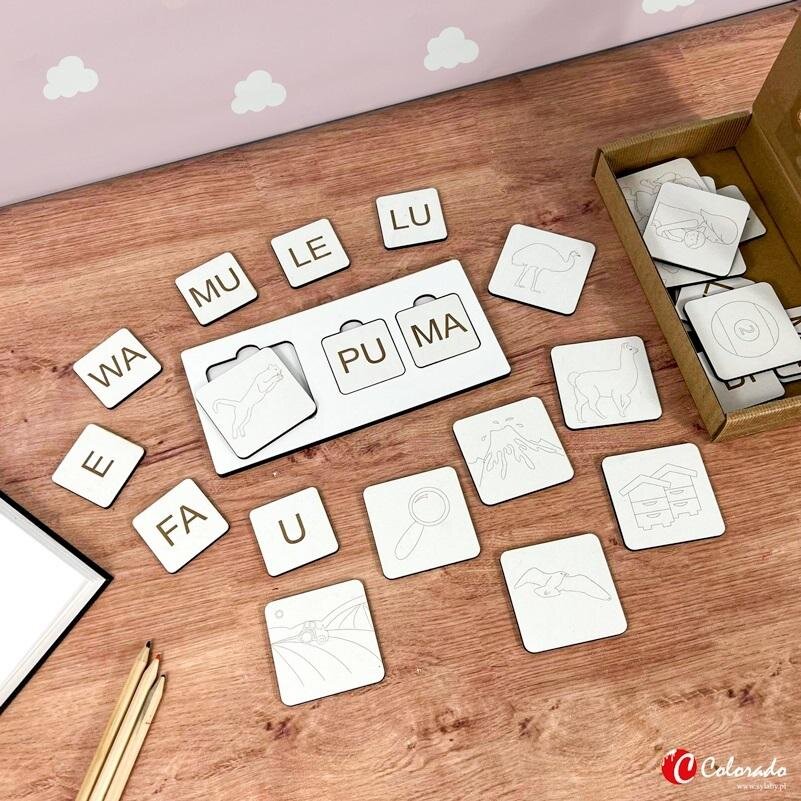 ZESTAW DO NAUKI CZYTANIA UKŁADANKA SYLABOWA CZ.1Ilość elementów: 30 elementów: 13 płytek z obrazkami (MAMA, LAMA, LALA, MAPA, LAWA, ULE, MEWA, POLE, PUMA, LUPA, BILA, EMU, FALE), 16 płytek z sylabami (z paradygmatami P, M, L, B, F, W) oraz podstawą bazową prečítať celé