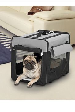 Lehká látková přepravka pro Vaše čtyřnohé miláčky s železnou konstrukcí. Boční strany jsou vybaveny průhlednou síťovinou, kterou je možné zakrýt. Barevné provedení černo/šedá.Rozměr: 94x56x71cm prečítať celé