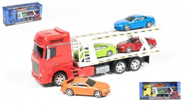 Auto přepravník + 4 auta plast 45 cm na setrvačník, 3 barvy (1 sada v krabici)