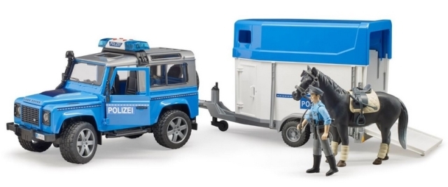 I v Bruder světě je potřeba dohlížet na dodržování zákonů a to zajistí např. sada Bruder 02588 Policejní Land Rover s přepravníkem na koně, policistou a figurkou koně.