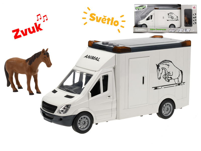 Auto přepravní 27cm na setrvačník na baterie se světlem a zvukem s koněm v krabičce