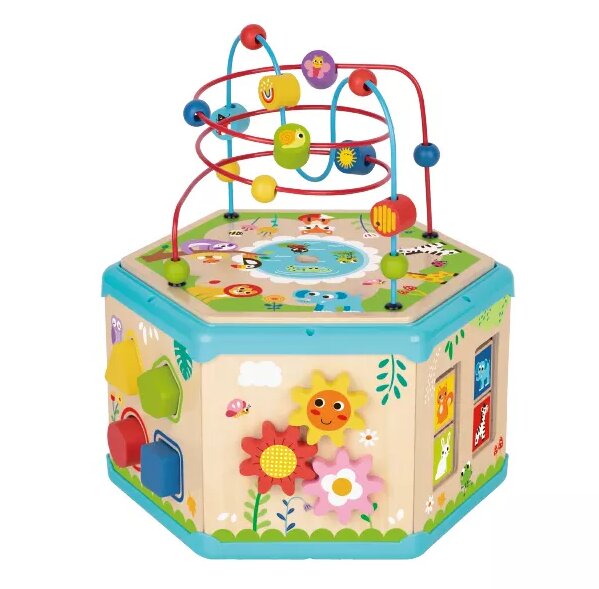 Kocka s aktivitami 7v1Drevený multifunkčný šesťuholník so 7 aktivitamiInteraktívna vzdelávacia hračka ponúka iný typ aktivity na každej strane. Deti môžu posúvať korálky bludiskom, otáčať ozubenými kolieskami, vkladať tvary alebo sa učiť hodiny. Nádherné prevedenie celého pultíka motivuje deti k...