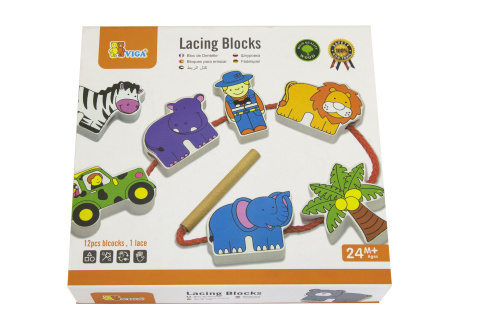 Dřevěné navlékání safari. Obsahuje 12 dřevěných bloků a 1 navlékací provázek. Baleno v krabičce, která slouží jako úschovný box. Rozměry balení cca 21 x 19 x 4,5 cm. Věk 24m+ prečítať celé