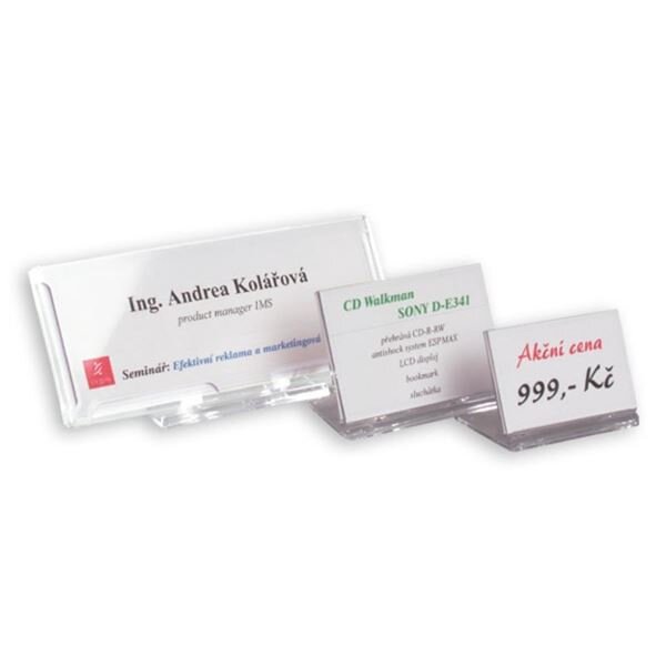 stolní identifikátor z průhledného pevného plastu se skládacím podstavcem ;uvnitř s čistou papírovou předlohou, na kterou stačí pouze dopsat potřebné informace ;lze využít jako nositel textů, popisků, nápisů, cenovek apod. ;rozměr: 80x57 mm ;balení 36 ks prečítať celé